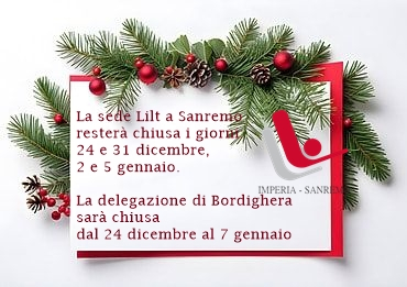 Gli uffici e ambulatori LILT, a Sanremo in Via Duca degli Abruzzi, resteranno chiusi oltre che nei giorni di Festa tradizionali anche il 24 e il 31 dicembre 2025 , e il 2 e il 5 gennaio 2026.