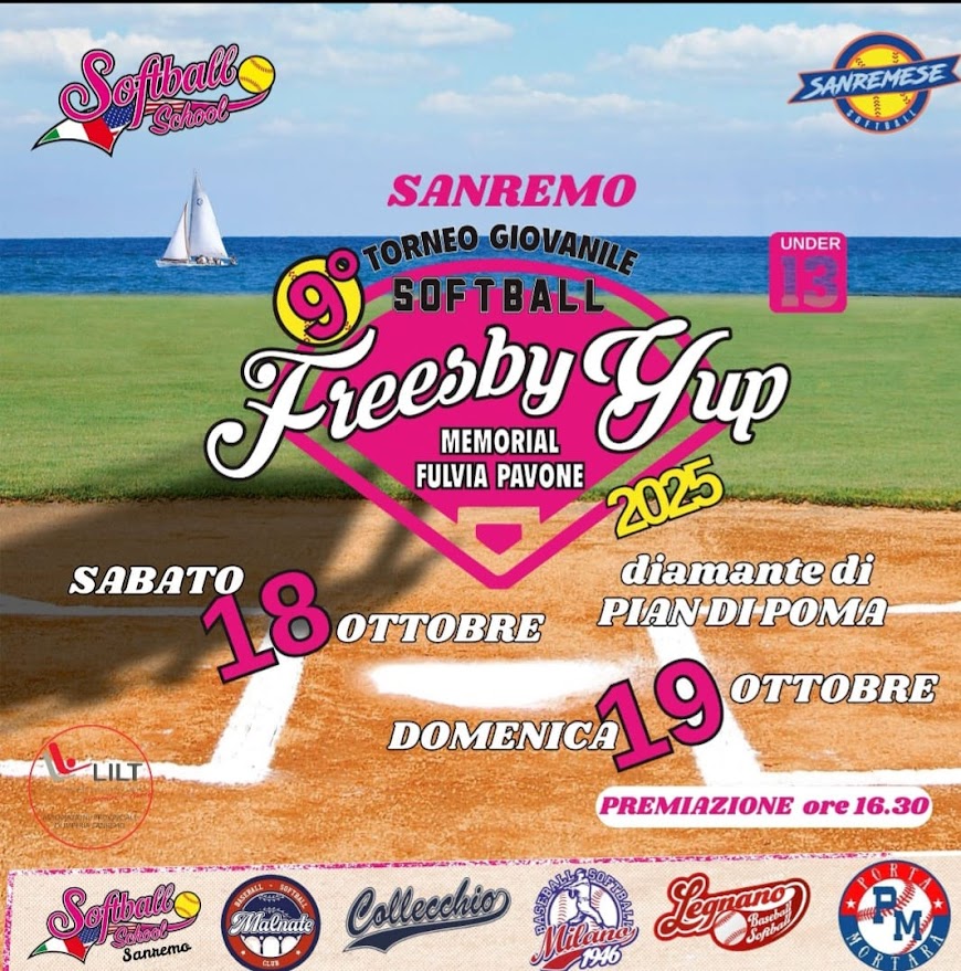 Sarà, questo il Nono Freesby Yup, memorial riservato alle atlete softball under 13, é dedicato al ricordo di Fulvia Pavone, seconda base del Sanremo Softball scomparsa 11 anni or sono e, come negli anni precedenti, la LILT – Lega Italiana per la Lotta contro i Tumori ha un ruolo fondamentale nella sensibilizzazione delle ragazze sulla scelta di un corretto stile di vita che vede proprio nello sport un importante alleato.