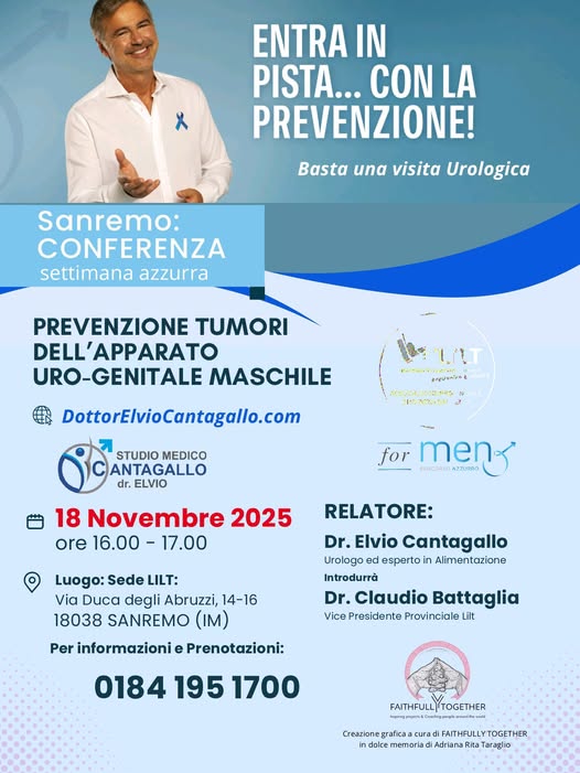 Il 18 novembre, presso la LILT di Imperia–Sanremo, il dottor Cantagallo, urologo, terrà una conferenza dedicata alla prevenzione nell’ambito della campagna Nastro Blu LILT.