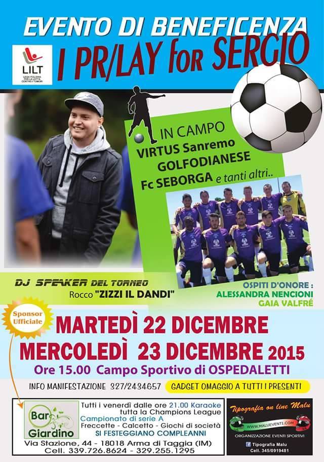 Martedì 22 e mercoledì 23 dicembre al Campo sportivo di Ospedaletti alle ore 15, si terrà il torneo di calcio “I PR/LAY for SERGIO” con intento benefico. In campo VIRTUS Sanremo, GOLFODIANESE, Fc SEBORGA e tanti altri…Parte degli incassi saranno devoluti alla sezione provinciale LILT. Info manifestazione 3272434657.